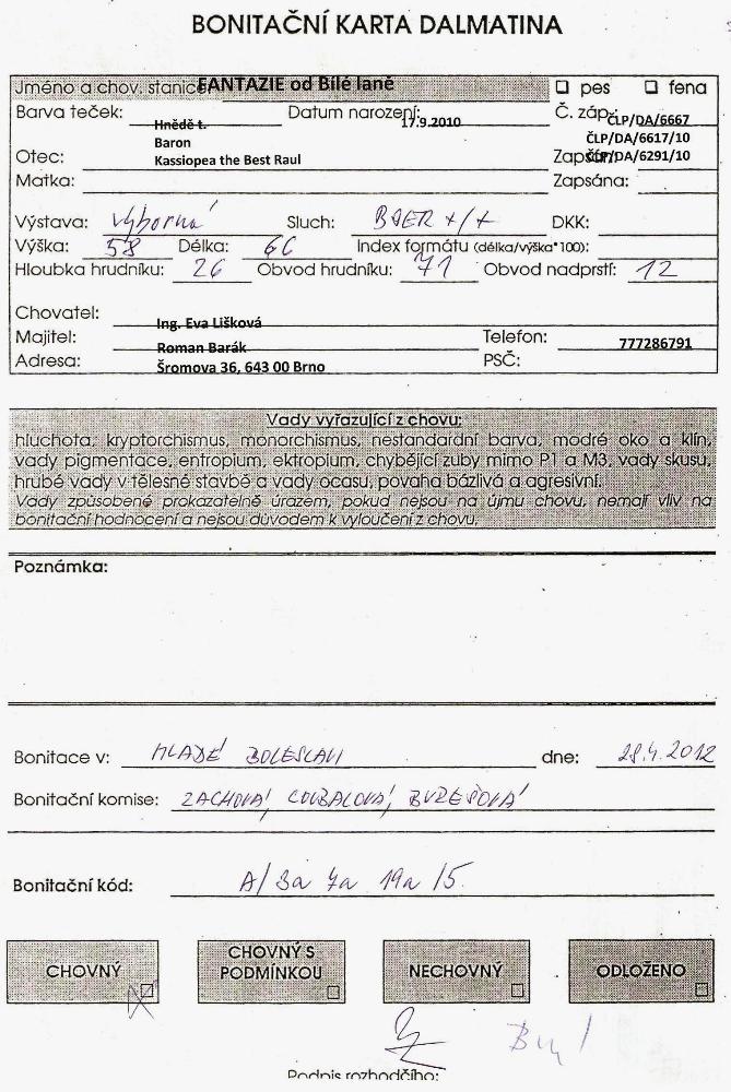 15xCAC, 2xres.CAC, 6xCACIB, 3xRes.CACIB, 9xBOB, BIG, Res.BIG, 3.BIG, 2x4.BIG, 2x Národní Vítěz, Klubový Vítěz 2010 Dalmatin Klubu SK, Klubový Vítěz 2011, Vítěz Střední a Východní Evropy 2010
